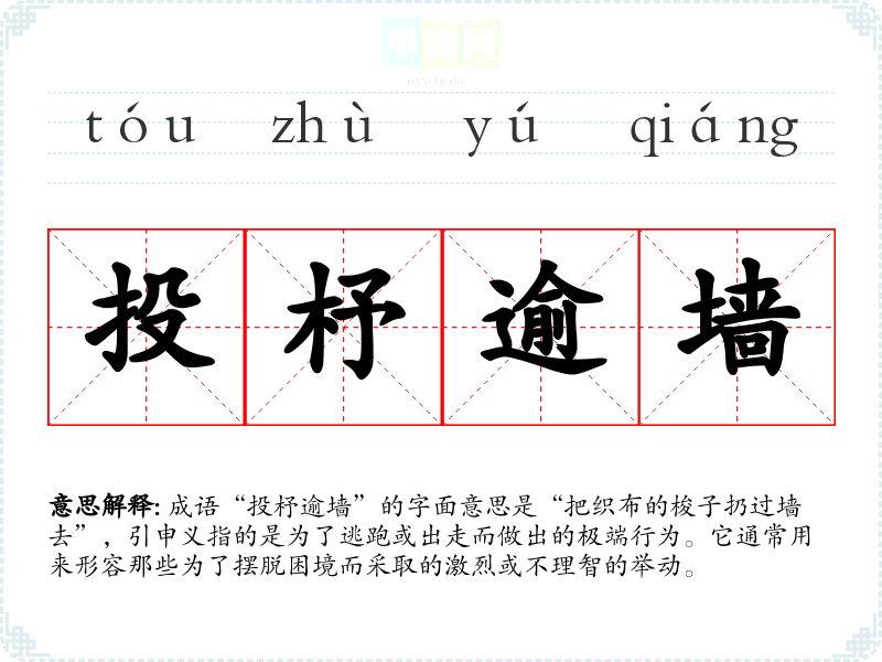 成语“投杼逾墙”的字面意思是“把织布的梭子扔过墙去”,引申义指的是为了逃跑或出走而做出的极端行为。它通常用来形容那些为了摆脱困境而采取的激烈或不理智的举动。