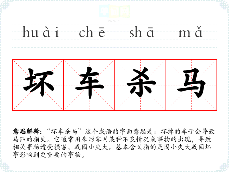 “坏车杀马”这个成语的字面意思是:坏掉的车子会导致马匹的损失。它通常用来形容因某种不良情况或事物的出现,导致相关事物遭受损害,或因小失大。基本含义指的是因小失大或因坏事影响到更重要的事物。