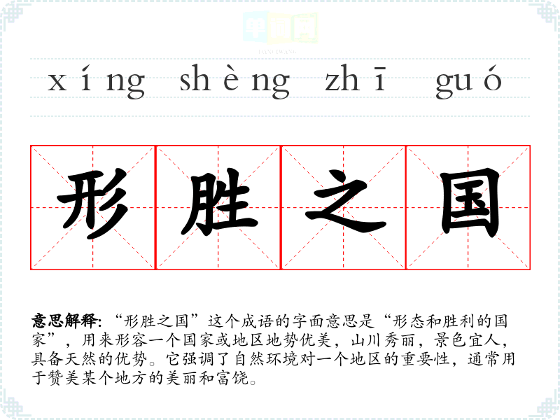 “形胜之国”这个成语的字面意思是“形态和胜利的国家”,用来形容一个国家或地区地势优美,山川秀丽,景色宜人,具备天然的优势。它强调了自然环境对一个地区的重要性,通常用于赞美某个地方的美丽和富饶。