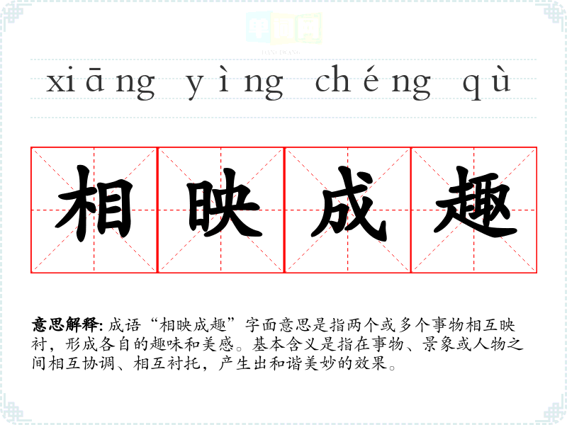 成语“相映成趣”字面意思是指两个或多个事物相互映衬,形成各自的趣味和美感。基本含义是指在事物、景象或人物之间相互协调、相互衬托,产生出和谐美妙的效果。