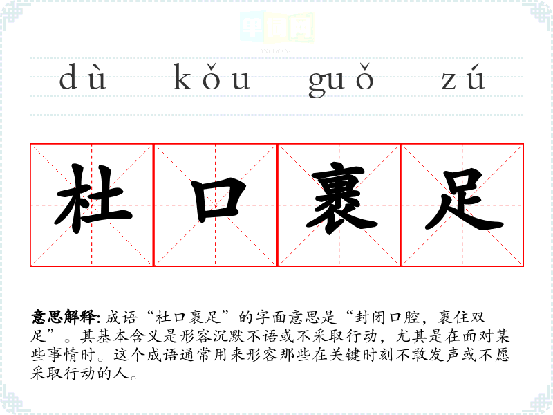 成语“杜口裹足”的字面意思是“封闭口腔,裹住双足”。其基本含义是形容沉默不语或不采取行动,尤其是在面对某些事情时。这个成语通常用来形容那些在关键时刻不敢发声或不愿采取行动的人。