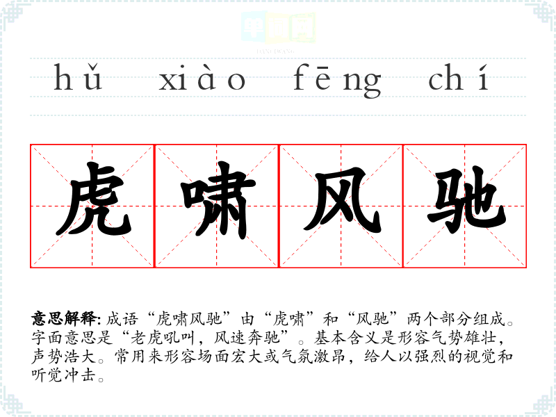 “虎啸风驰”并没有具体的历史典故出处,但其意象源于古代对和风的描绘。作为一种猛兽,象征着力量和威严;而“风驰”则形容迅速的行动。两者结合体现出一种强烈的自然力量和气势,通常出现在古典诗词或文学作品中。