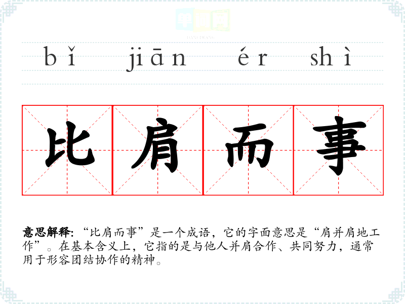 “比肩而事”是一个成语,它的字面意思是“肩并肩地工作”。在基本含义上,它指的是与他人并肩合作、共同努力,通常用于形容团结协作的精神。