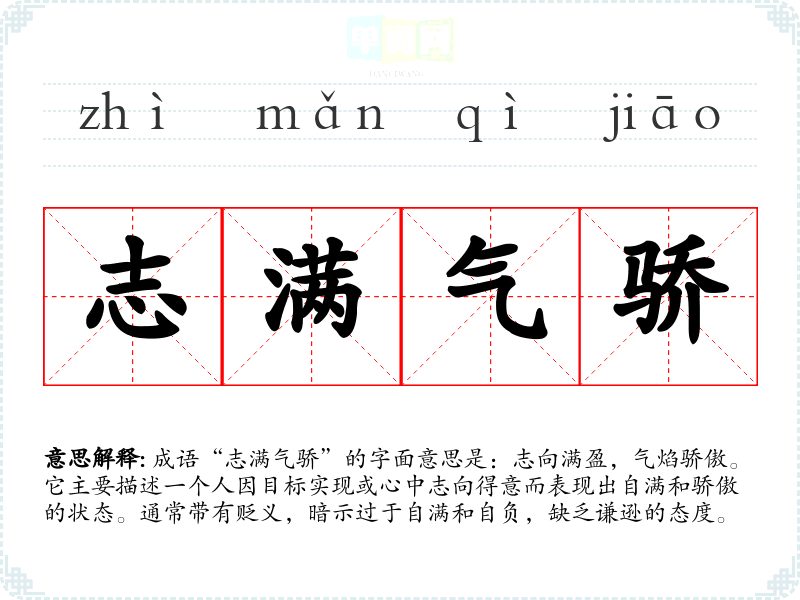 通过对“志满气骄”的分析,我理解到,保持谦逊与自省是个人成长的重要部分。这个成语不仅在日常交流中具有警示作用,也是我在学习和表达中应当时刻关注的意识。