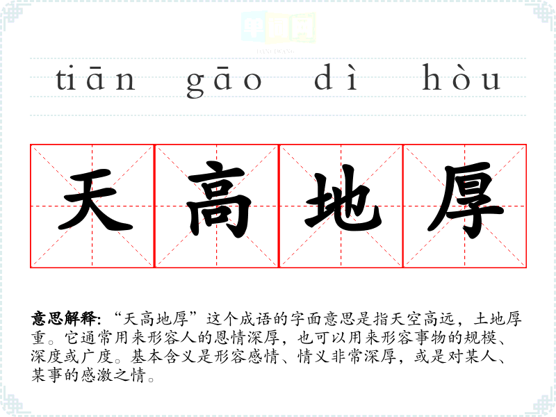| 天高地厚 | 原形容天地的广大,后形容恩德极深厚。也比喻事情的艰巨、严重,关系的重大。 |