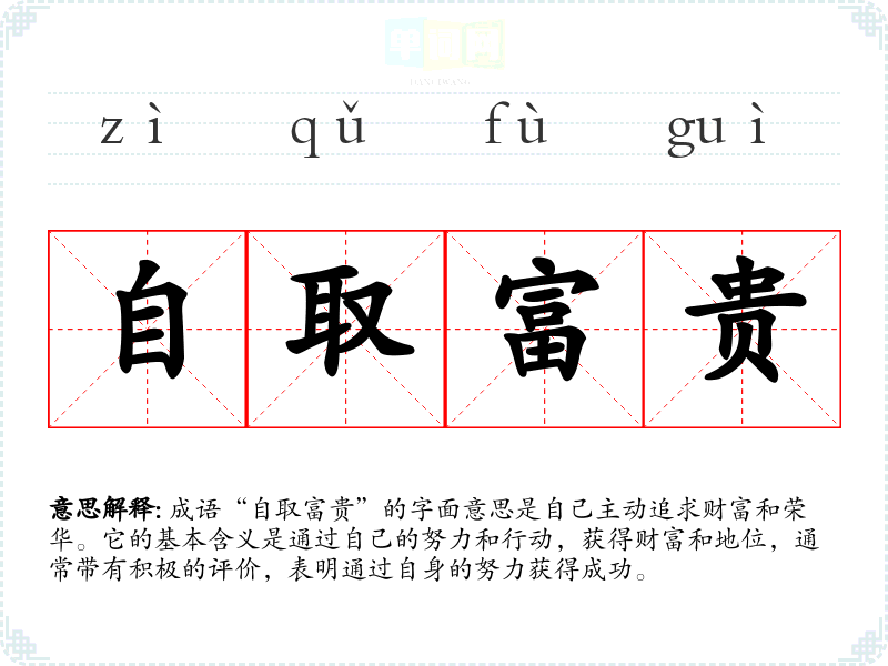 成语“自取富贵”的字面意思是自己主动追求财富和荣华。它的基本含义是通过自己的努力和行动,获得财富和地位,通常带有积极的评价,表明通过自身的努力获得成功。