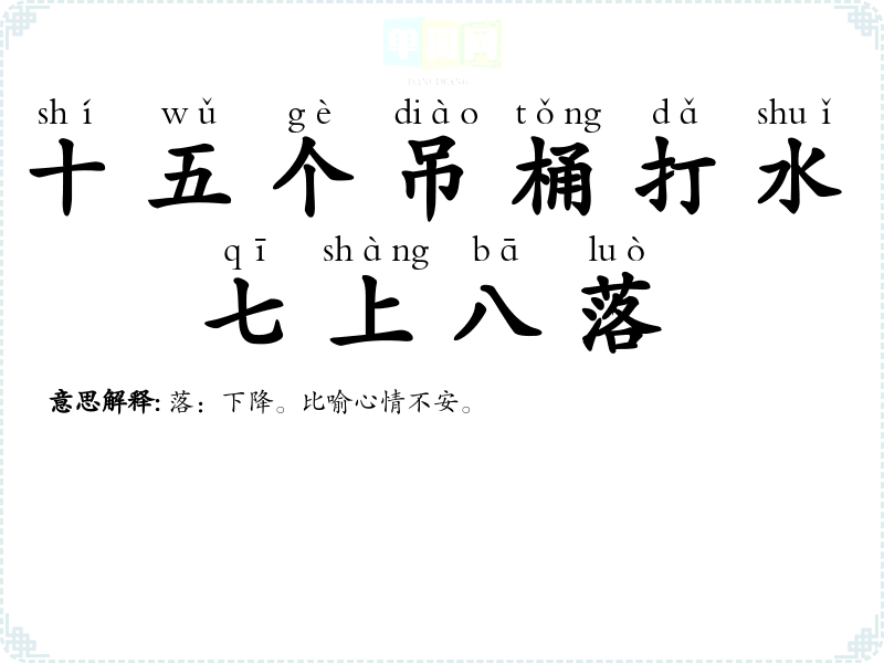 | 十五个吊桶打水,七上八落 | 落:下降。比喻心情不安。 |