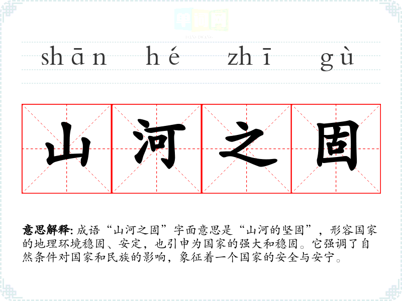 成语“山河之固”字面意思是“山河的坚固”,形容国家的地理环境稳固、安定,也引申为国家的强大和稳固。它强调了自然条件对国家和民族的影响,象征着一个国家的安全与安宁。