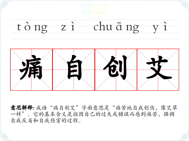 成语“痛自创艾”字面意思是“痛苦地自我创伤,像艾草一样”。它的基本含义是指因自己的过失或错误而感到痛苦,强调自我反省和自我伤害的过程。