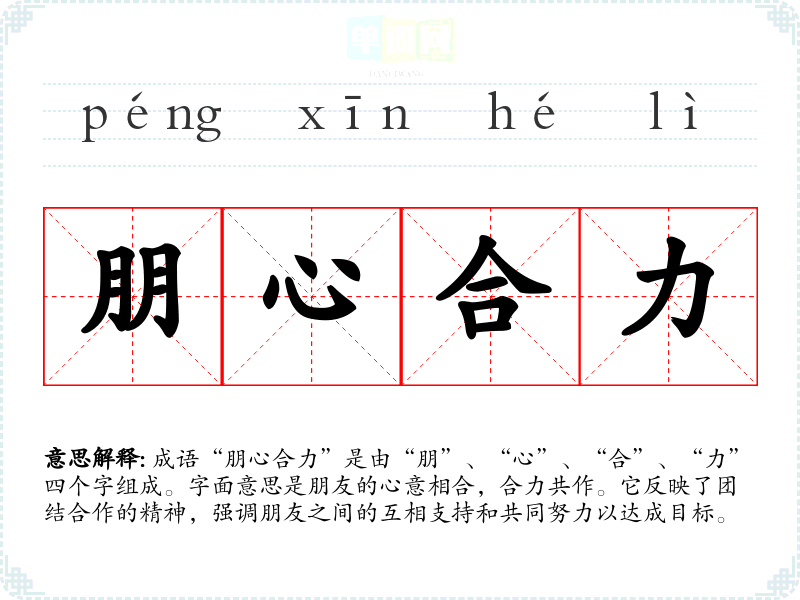 成语“朋心合力”是由“朋”、“心”、“合”、“力”四个字组成。字面意思是朋友的心意相合,合力共作。它反映了团结合作的精神,强调朋友之间的互相支持和共同努力以达成目标。