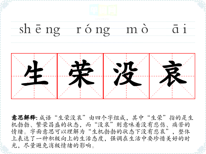 成语“生荣没哀”由四个字组成,其中“生荣”指的是生机勃勃、繁荣昌盛的状态,而“没哀”则意味着没有悲伤、痛苦的情绪。字面意思可以理解为“生机勃勃的状态下没有悲哀”,整体上表达了一种积极向上的生活态度,强调在生活中要珍惜美好的时光,尽量避免消极情绪的影响。