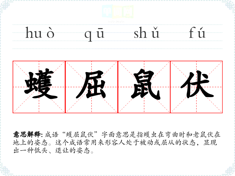 成语“蠖屈鼠伏”字面意思是指蠖虫在弯曲时和老鼠伏在地上的姿态。这个成语常用来形容人处于被动或屈从的状态,显现出一种低头、退让的姿态。