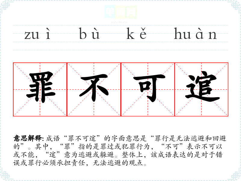 成语“罪不可逭”的字面意思是“罪行是无法逃避和回避的”。其中,“罪”指的是罪过或犯罪行为,“不可”表示不可以或不能,“逭”意为逃避或躲避。整体上,该成语表达的是对于错误或罪行必须承担责任,无法逃避的观点。