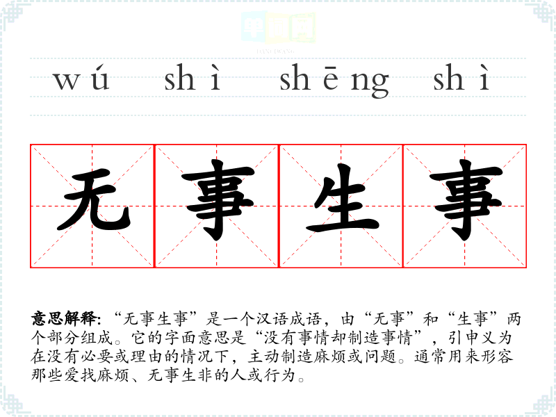 “无事生事”是一个汉语成语,由“无事”和“生事”两个部分组成。它的字面意思是“没有事情却制造事情”,引申义为在没有必要或理由的情况下,主动制造麻烦或问题。通常用来形容那些爱找麻烦、无事生非的人或行为。