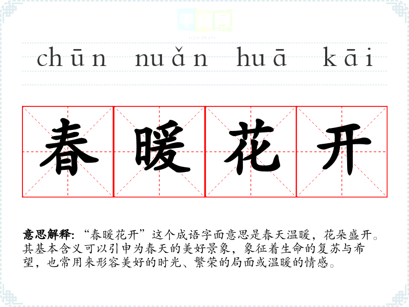 “春暖花开”这个成语字面意思是春天温暖,花朵盛开。其基本含义可以引申为春天的美好景象,象征着生命的复苏与希望,也常用来形容美好的时光、繁荣的局面或温暖的情感。
