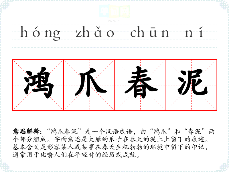 在*文化中,春天常被视为生机与希望的象征。因此,“鸿爪春泥”不仅反映了个人成长的过程,也体现了对生命和自然的尊重与热爱。现代社会中,尤其是在教育和职场环境中,这个成语可以鼓励人们珍惜年轻时的学与成长经历。