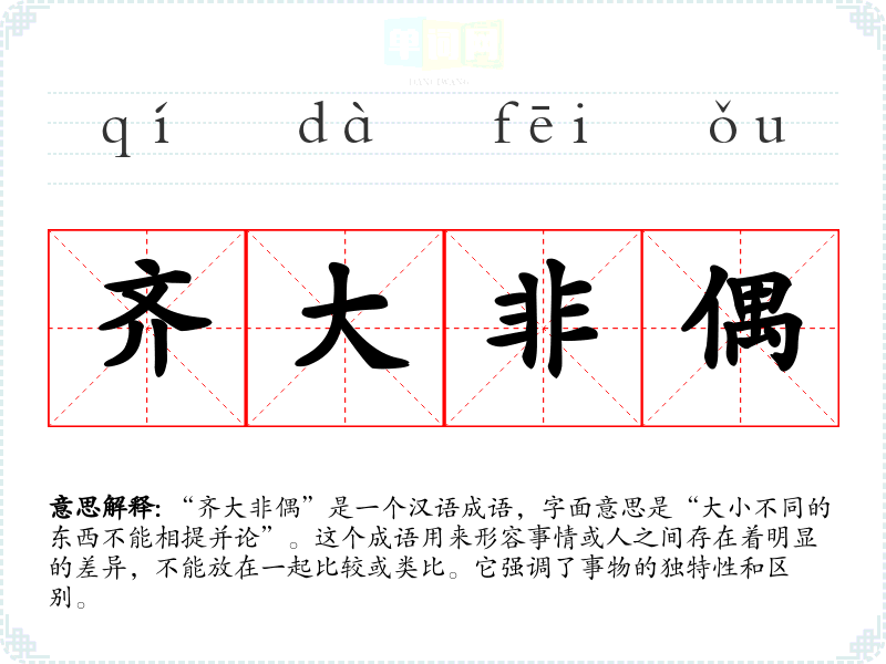“齐大非偶”是一个汉语成语,字面意思是“大小不同的东西不能相提并论”。这个成语用来形容事情或人之间存在着明显的差异,不能放在一起比较或类比。它强调了事物的独特性和区别。