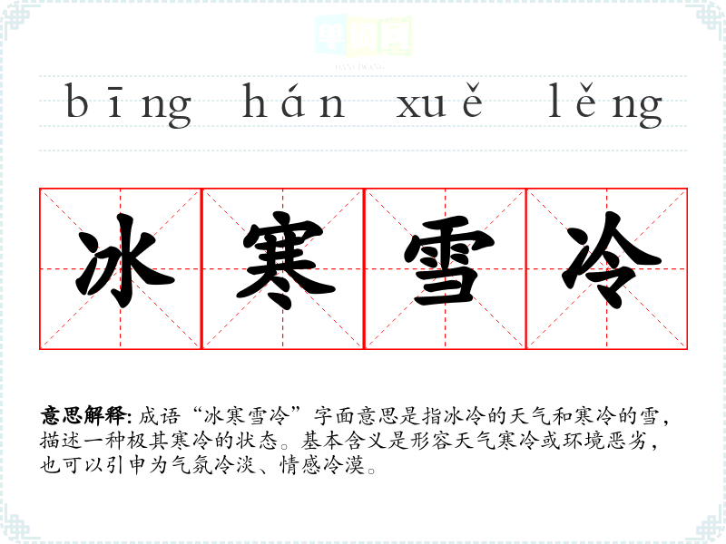 - 同义成语:寒冷刺骨(形容非常寒冷)、冷若冰霜(形容态度冷淡)。