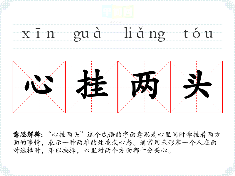 - 左右为难:形容在两种选择之间难以决断,与“心挂两头”意思相近。