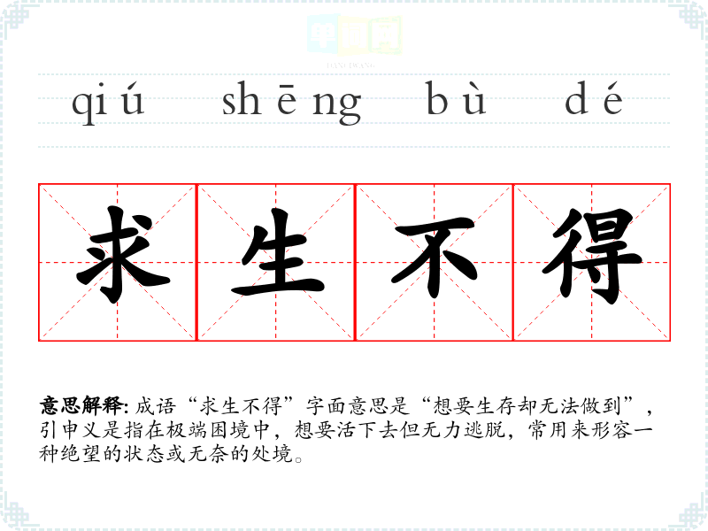 成语“求生不得”字面意思是“想要生存却无法做到”,引申义是指在极端困境中,想要活下去但无力逃脱,常用来形容一种绝望的状态或无奈的处境。