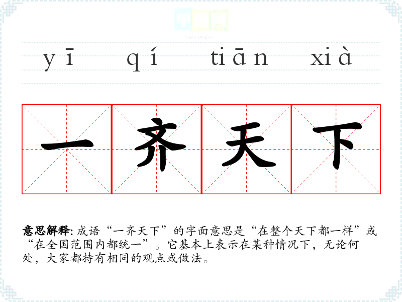 “一齐天下”并不是一个非常传统的成语,可能源于古代文学或民间口语表达,常常用来描述一种普遍的认同或一致的状态。在古代,国家的统一和人民的共识被视为政治稳定和社会和谐的重要因素,因此这个表达也隐含了对团结一致的期望。