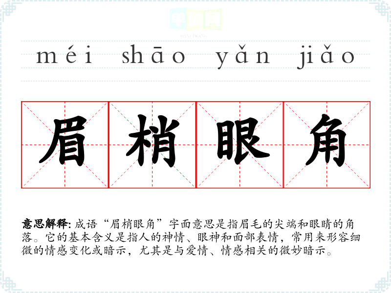 成语“眉梢眼角”字面意思是指眉毛的尖端和眼睛的角落。它的基本含义是指人的神情、眼神和面部表情,常用来形容细微的情感变化或暗示,尤其是与爱情、情感相关的微妙暗示。
