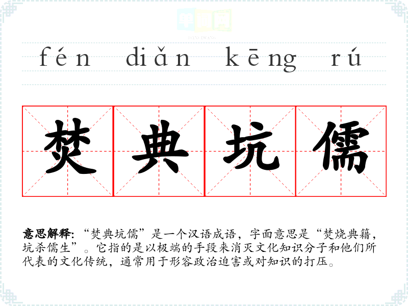 “焚典坑儒”是一个汉语成语,字面意思是“焚烧典籍,坑杀儒生”。它指的是以极端的手段来消灭文化知识分子和他们所代表的文化传统,通常用于形容政治迫害或对知识的打压。