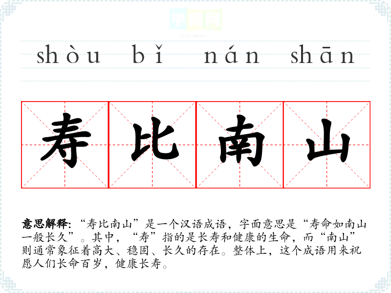 | 寿比南山 | 寿命象终南山那样长久。用于祝人长寿。 |