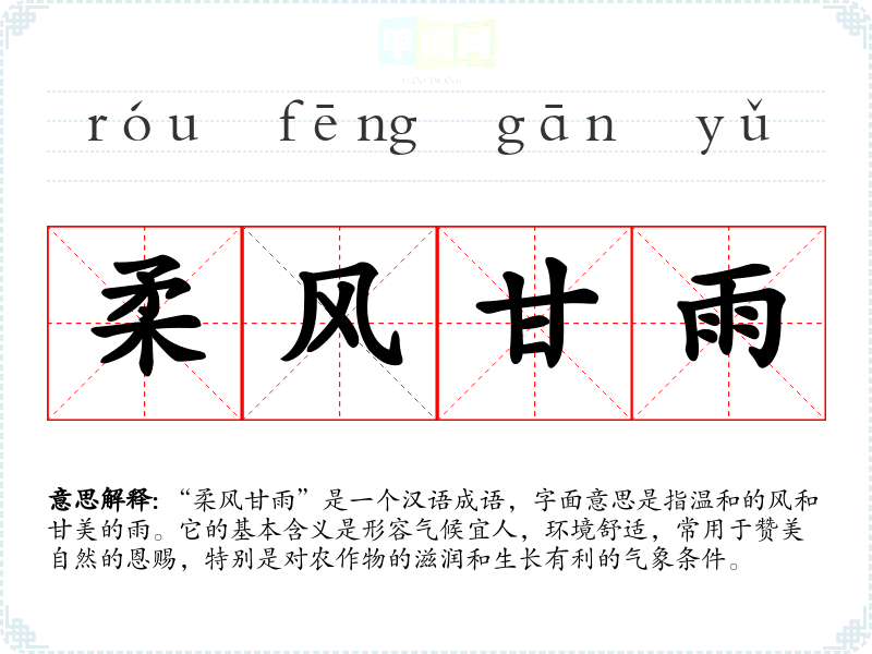 “柔风甘雨”是一个汉语成语,字面意思是指温和的风和甘美的雨。它的基本含义是形容气候宜人,环境舒适,常用于赞美自然的恩赐,特别是对农作物的滋润和生长有利的气象条件。