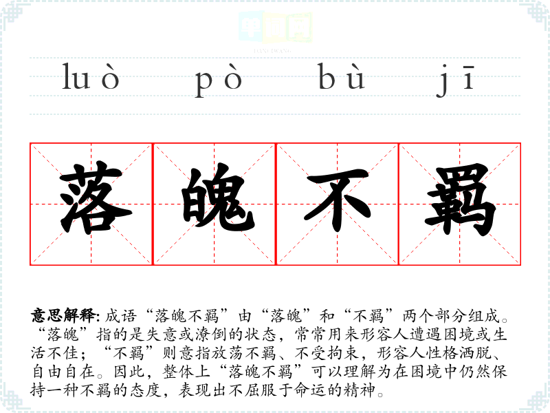 成语“落魄不羁”由“落魄”和“不羁”两个部分组成。“落魄”指的是失意或潦倒的状态,常常用来形容人遭遇困境或生活不佳;“不羁”则意指放荡不羁、不受拘束,形容人性格洒脱、自由自在。因此,整体上“落魄不羁”可以理解为在困境中仍然保持一种不羁的态度,表现出不屈服于命运的精神。