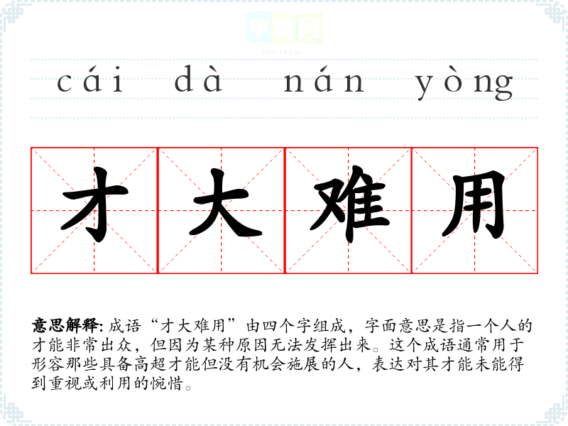成语“才大难用”由四个字组成,字面意思是指一个人的才能非常出众,但因为某种原因无法发挥出来。这个成语通常用于形容那些具备高超才能但没有机会施展的人,表达对其才能未能得到重视或利用的惋惜。