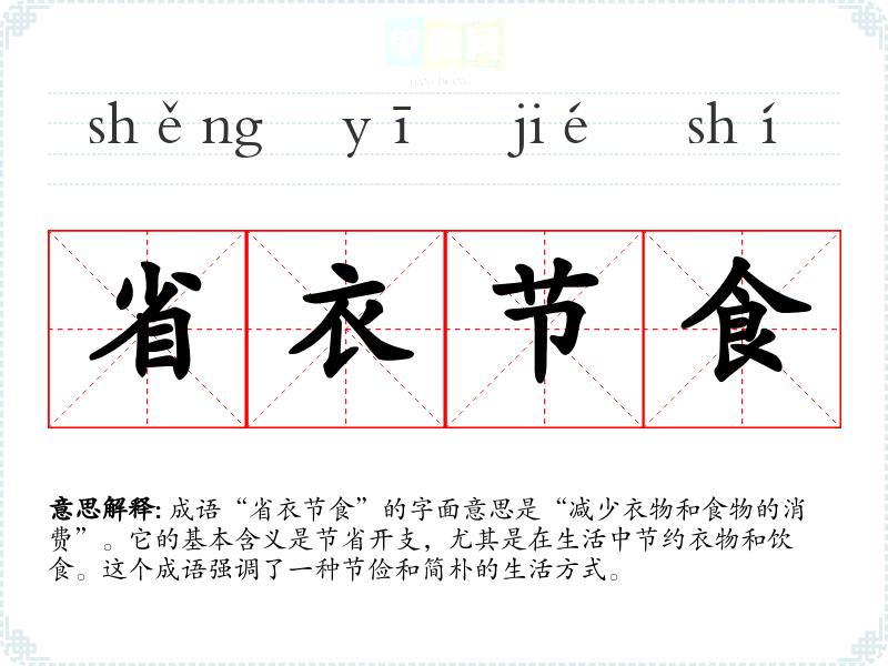 成语“省衣节食”的字面意思是“减少衣物和食物的消费”。它的基本含义是节省开支,尤其是在生活中节约衣物和饮食。这个成语强调了一种节俭和简朴的生活方式。