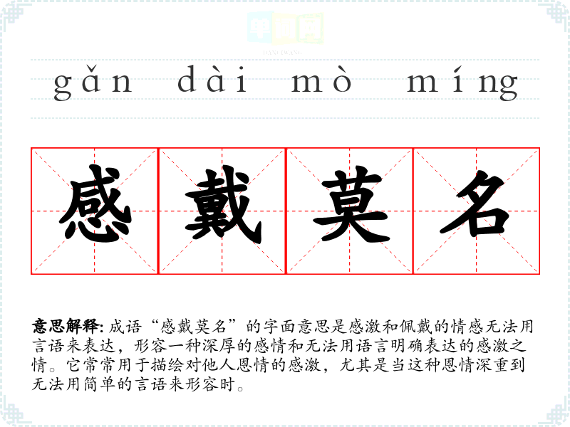 “感戴莫名”的具体来源并没有明确的历史典故或文学出处,但它体现了中华文化中对于感恩和情感表达的重视。古代文人常常在诗文中表达对恩情的感激,因而这一成语也可以视作对传统文化中感恩情感的一种总结。