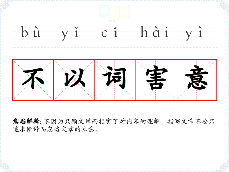 | 不以词害意 | 不因为只顾文辞而损害了对内容的理解。指写文章不要只追求修辞而忽略文章的立意。 |