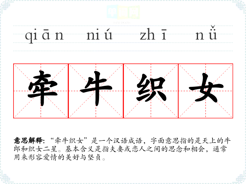 “牵牛织女”是一个汉语成语,字面意思指的是天上的牛郎和织女二星。基本含义是指夫妻或恋人之间的思念和相会,通常用来形容爱情的美好与坚贞。