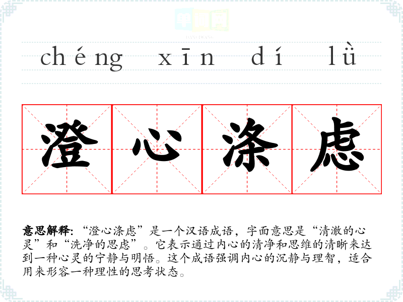 “澄心涤虑”是一个汉语成语,字面意思是“清澈的心灵”和“洗净的思虑”。它表示通过内心的清净和思维的清晰来达到一种心灵的宁静与明悟。这个成语强调内心的沉静与理智,适合用来形容一种理性的思考状态。