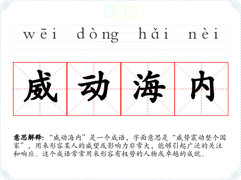 “威动海内”是一个成语,字面意思是“威势震动整个国家”,用来形容某人的威望或影响力非常大,能够引起广泛的关注和响应。这个成语常常用来形容有权势的人物或卓越的成就。
