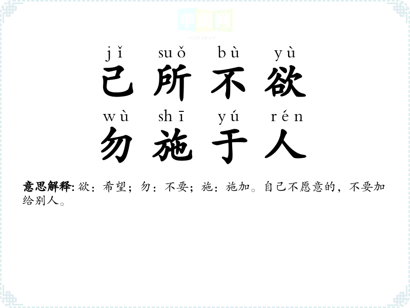 | 己所不欲,勿加诸人 | 欲:想要,希望;加:给予。自己不愿意的,不要加给别人。 |