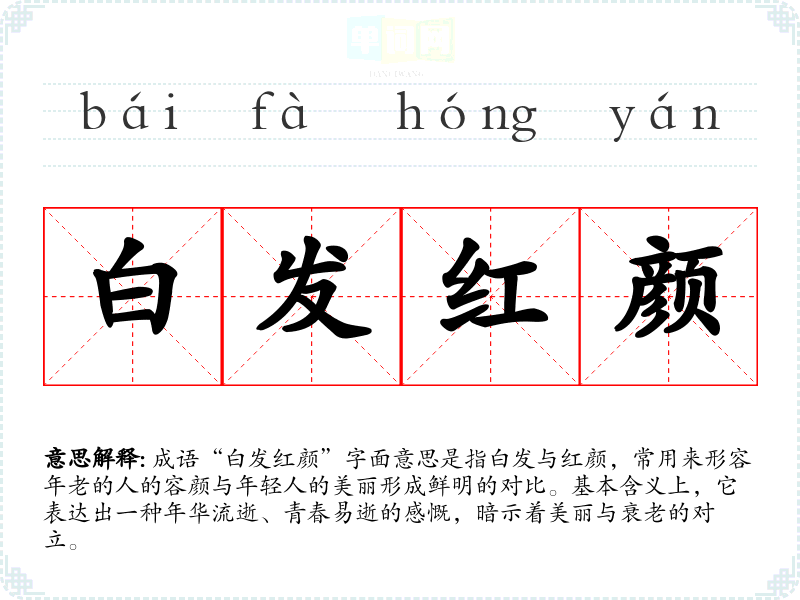 成语“白发红颜”字面意思是指白发与红颜,常用来形容年老的人的容颜与年轻人的美丽形成鲜明的对比。基本含义上,它表达出一种年华流逝、青春易逝的感慨,暗示着美丽与衰老的对立。