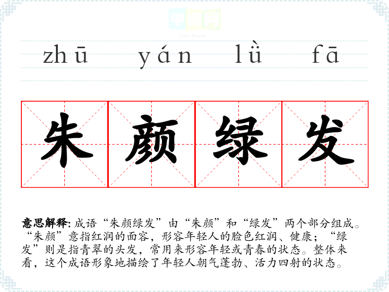 成语“朱颜绿发”由“朱颜”和“绿发”两个部分组成。“朱颜”意指红润的面容,形容年轻人的脸色红润、健康;“绿发”则是指青翠的头发,常用来形容年轻或青春的状态。整体来看,这个成语形象地描绘了年轻人朝气蓬勃、活力四射的状态。