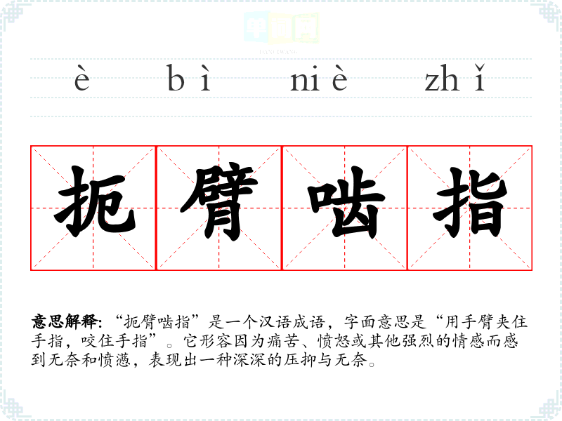 “扼臂啮指”是一个汉语成语,字面意思是“用手臂夹住手指,咬住手指”。它形容因为痛苦、愤怒或其他强烈的情感而感到无奈和愤懑,表现出一种深深的压抑与无奈。