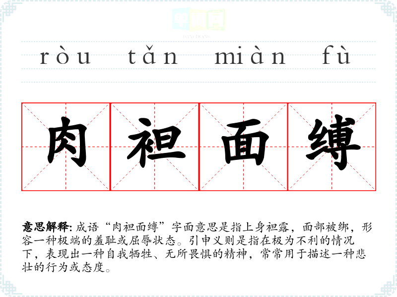 成语“肉袒面缚”字面意思是指上身袒露,面部被绑,形容一种极端的羞耻或屈辱状态。引申义则是指在极为不利的情况下,表现出一种自我牺牲、无所畏惧的精神,常常用于描述一种悲壮的行为或态度。