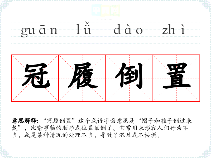 “冠履倒置”这个成语字面意思是“帽子和鞋子倒过来戴”,比喻事物的顺序或位置颠倒了。它常用来形容人们行为不当,或是某种情况的处理不当,导致了混乱或不协调。