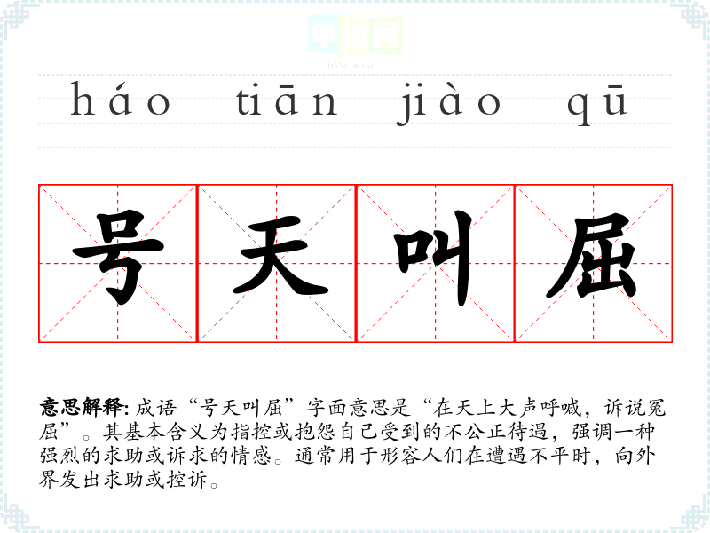 成语“号天叫屈”字面意思是“在天上大声呼喊,诉说冤屈”。其基本含义为指控或抱怨自己受到的不公正待遇,强调一种强烈的求助或诉求的情感。通常用于形容人们在遭遇不平时,向外界发出求助或控诉。