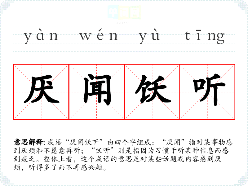成语“厌闻饫听”由四个字组成:“厌闻”指对某事物感到厌烦和不愿意再听;“饫听”则是指因为习惯于听某种信息而感到疲乏。整体上看,这个成语的意思是对某些话题或内容感到厌烦,听得多了而不再感兴趣。