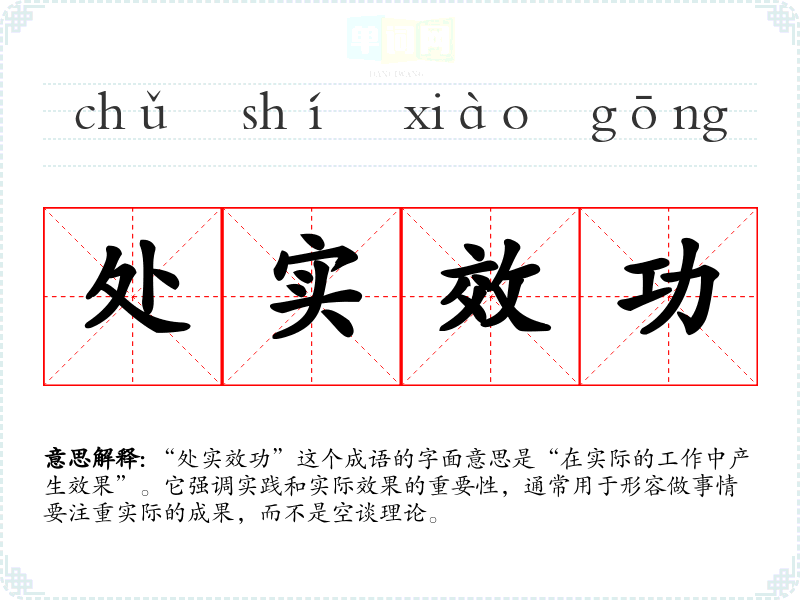 “处实效功”这个成语的字面意思是“在实际的工作中产生效果”。它强调实践和实际效果的重要性,通常用于形容做事情要注重实际的成果,而不是空谈理论。