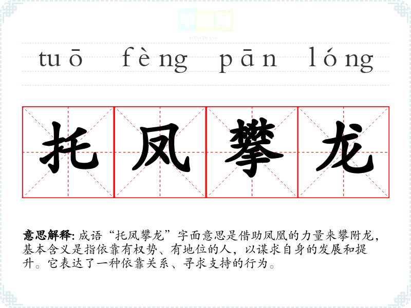 成语“托凤攀龙”字面意思是借助凤凰的力量来攀附龙,基本含义是指依靠有权势、有地位的人,以谋求自身的发展和提升。它表达了一种依靠关系、寻求支持的行为。