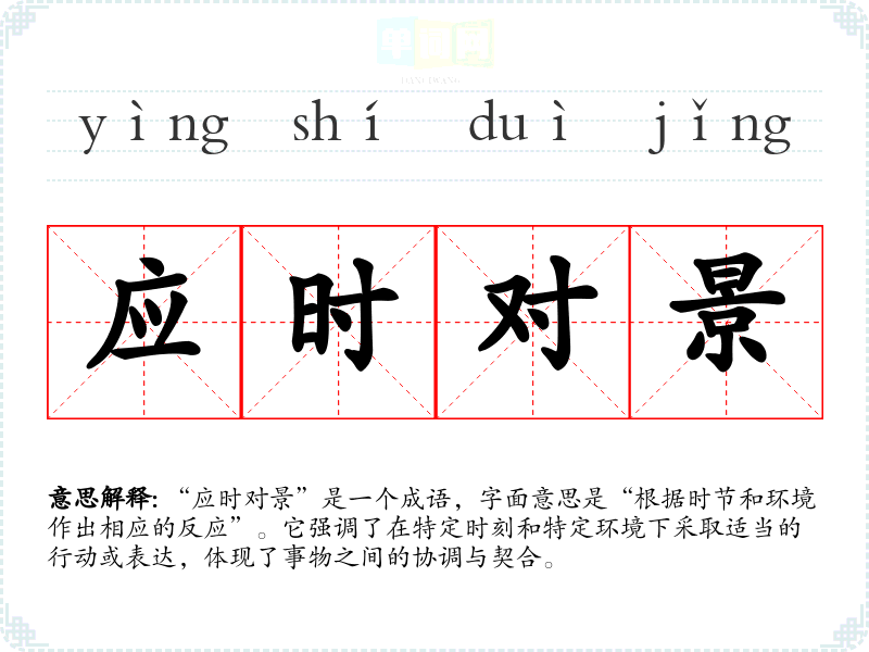 “应时对景”是一个成语,字面意思是“根据时节和环境作出相应的反应”。它强调了在特定时刻和特定环境下采取适当的行动或表达,体现了事物之间的协调与契合。