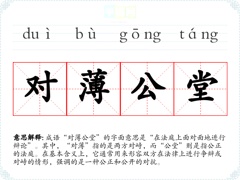 成语“对公堂”的字面意思是“在法庭上面对面地进行辩论”。其中,“对”指的是两方对峙,而“公堂”则是指公正的法庭。在基本含义上,它通常用来形容双方在法律上进行争辩或对峙的情形,强调的是一种公正和公开的对抗。