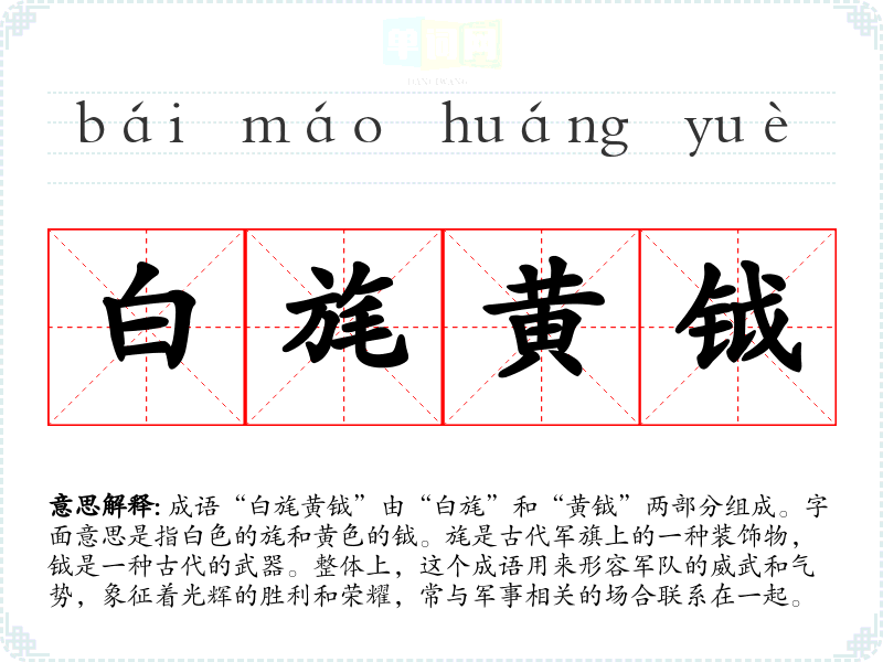 成语“白旄黄钺”由“白旄”和“黄钺”两部分组成。字面意思是指白色的旄和黄色的钺。旄是古代军旗上的一种装饰物,钺是一种古代的武器。整体上,这个成语用来形容军队的威武和气势,象征着光辉的胜利和荣耀,常与军事相关的场合联系在一起。